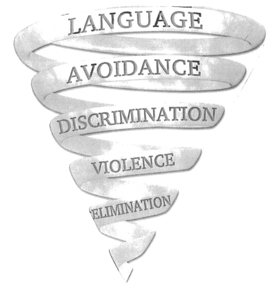 The Spiral of Injustice presents a downward spiral to explore injustice through the devolving sequence of language, avoidance, discrimination, violence, and elimination.