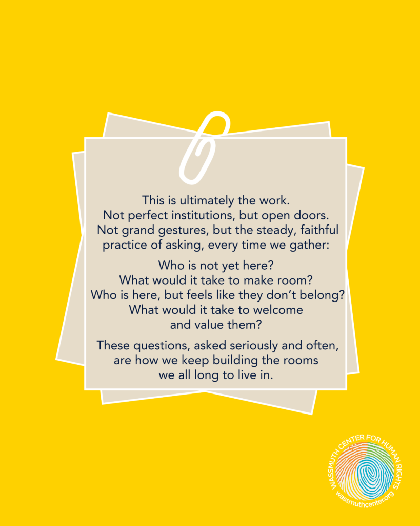 This is ultimately the work. Not perfect institutions, but open doors. Not grand gestures, but the steady, faithful practice of asking, every time we gather: