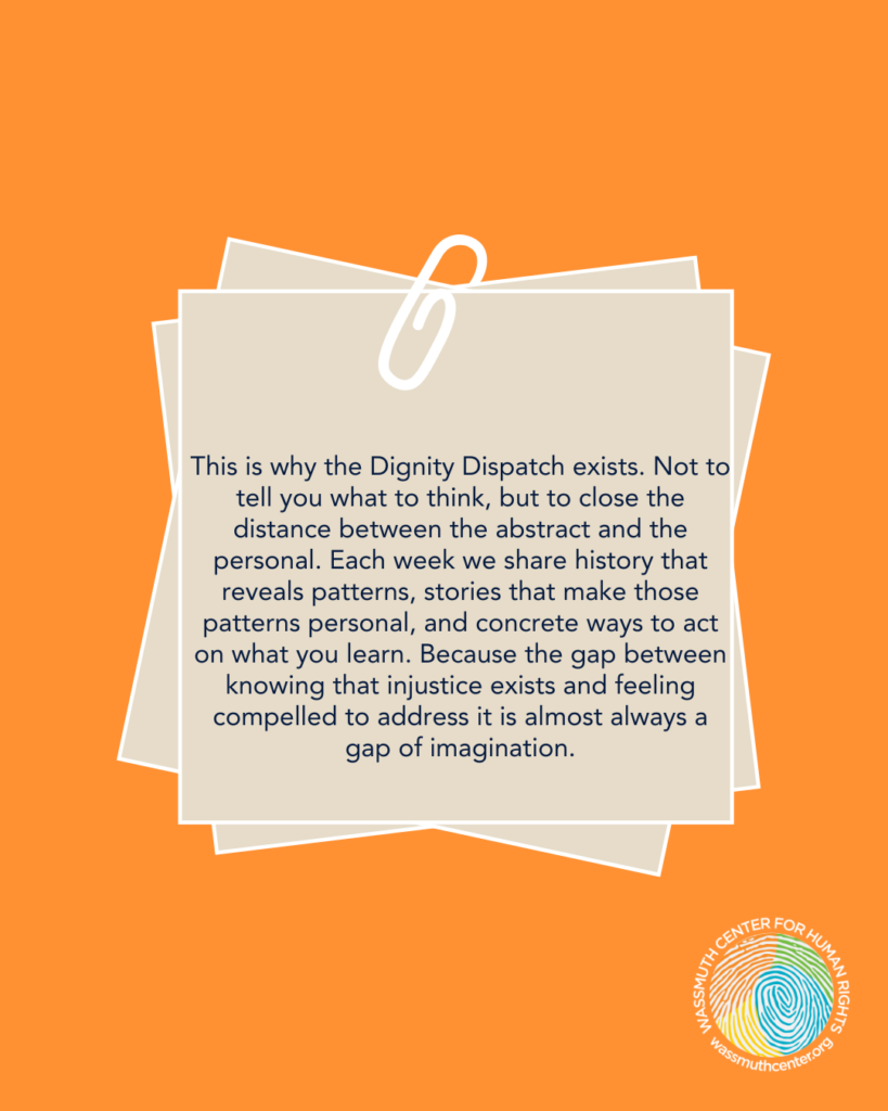 The Imagination Gap March 23, 2026 Whether we recognize it or not, we are constantly deciding how much other people’s lives matter to us — in the stories we tell, the policies we tolerate, and in the moments we speak up or stay silent. Dignity is not something we grant. It is something we acknowledge. Or fail to. And what is being tested, what has always been tested, is whether we actually believe that every person’s life is valuable. Most of us would say yes without hesitation. But belief is not the same as imagination. And imagination — the capacity to feel the weight of someone else’s experience as equal to our own — is where we most often fail. It is not a failure of information. It never has been. In 1942, when Japanese American families on the West Coast were forced from their homes, their businesses, and their communities, the facts were not hidden. Neighbors watched it happen. They saw the suitcases, the boarded-up storefronts, the children pulled from school. Most did not act out of hatred. Many simply could not imagine themselves in those families’ place. The suffering was visible, but it did not register as urgent — because it was happening to someone else. A decade earlier, as Mexican American families were swept up in mass deportation campaigns that removed as many as two million people from the country, including many American citizens, the same dynamic held. Families who had lived in their communities for decades were loaded onto trains heading south. The loss was enormous and the injustice was plain, but for most of those unaffected, it remained someone else’s problem. That pattern has never stopped. When we read a headline today about families being separated, most of us feel a flicker of concern — and then we scroll past. Not because we are cruel, but because those families remain abstract. We do not know their histories, their hopes, their lives. Without that specificity, suffering stays at a comfortable distance. But consider what changes when a story becomes particular, when the headline becomes a mother in your community who fled violence, rebuilt her life, and now faces deportation to a country where she has no one left. Suddenly the policy is not a debate. It is life. This is why the Dignity Dispatch exists. Not to tell you what to think, but to close the distance between the abstract and the personal. Each week we share history that reveals patterns, stories that make those patterns personal, and concrete ways to act on what you learn. Because the gap between knowing that injustice exists and feeling compelled to address it is almost always a gap of imagination. When a policy affects someone you can picture — a friend, a neighbor, a family you have come to know through their story — it becomes much harder to look away. We are not asking you to carry the weight of every injustice at once. We are inviting you to widen, just slightly, the circle of lives you pay attention to. Read one story this week about someone whose experience is unfamiliar. Learn one piece of history you were not taught. Ask one question about who is affected by a decision you previously took for granted. These are small acts, but they are the building blocks of a more imaginative — and therefore more just — community. The opposite of injustice is not perfection. It is attention.